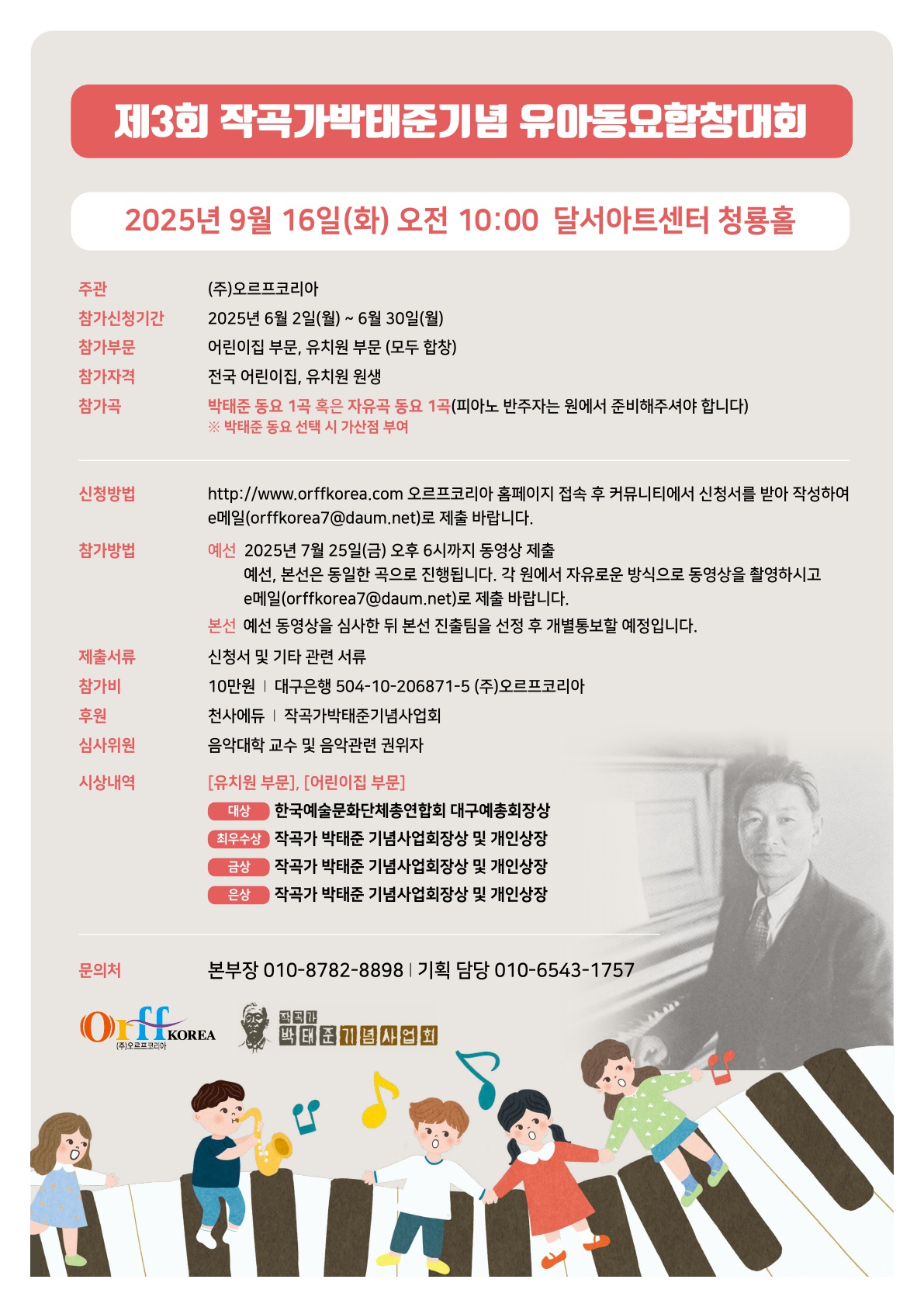 ↑ 위 첨부파일을 클릭하여 받으시면 됩니다. 2025 작곡가박태준기념 유아합창대회 - 2025년 9월 16일 오전10시 달서아트센터 청룡홀 - *참가신청기간: 2025년 6월 2일 ~ 6월 30일 *참가부문: 어린이집 부문, 유치원 부문 (모두 합창) *참가자격: 전국 어린이집, 유치원 원생 *참가곡: 총 1곡 (박태준 동요 1곡 혹은 자유곡 동요 1곡) ※ 박태준 동요 선택 시 가산점 부여되며, 피아노 반주자는 원에서 준비해주셔야 합니다 *신청방법: http://www.orffkorea.com 오르프코리아 홈페이지 접속 후 커뮤니티에서 신청서를 받아 작성하여 e메일(orffkorea7@daum.net)로 제출 바랍니다. *참가방법 - 예선: 2025년 7월 25일 오후 6시까지 동영상 제출 예선, 본선은 동일한 곡으로 진행됩니다. 각 원에서 자유로운 방식으로 동영상을 촬영하시고 e메일(orffkorea7@daum.net)로 제출 바랍니다. - 본선: 예선 동영상을 심사한 뒤 본선 진출팀을 추려 개별통보할 예정입니다. *제출서류: 신청서 및 기타 관련 서류 *참가비: 10만원 / 대구은행 504-10-206871-5 (주)오르프코리아 (입금자명은 반드시 원명으로 기재) *후원: 천사에듀 / 작곡가 박태준 기념사업회 *심사위원: 음악대학 교수 및 음악관련 권위자 *시상내역: 본선 [어린이집 부문, 유치원 부문] - 대상 상장(한국예술문화단체총연합회 대구예총회장상) - 최우수상 상장(작곡가 박태준 기념사업회장상) - 금상 상장(작곡가 박태준 기념사업회장상) - 은상(작곡가 박태준 기념사업회장상)
